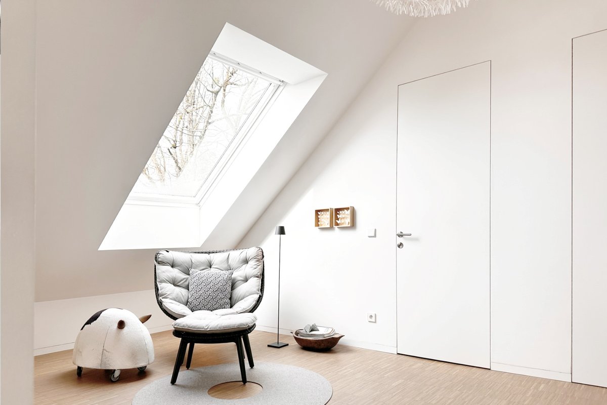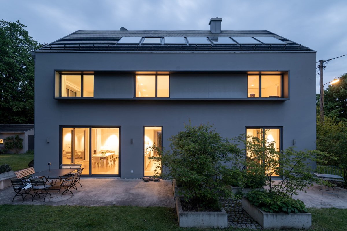 dafür, dass das Haus auch am Abend gemütlich und einladend wirkt. Ein besonderes Highlight ist die beleuchtete Treppe. Die charakteristische Form des Hauptgebäudes findet sich auch im Gartenhaus wieder, das als inspirierendes Büro für eine Grafikdesignerin dient.